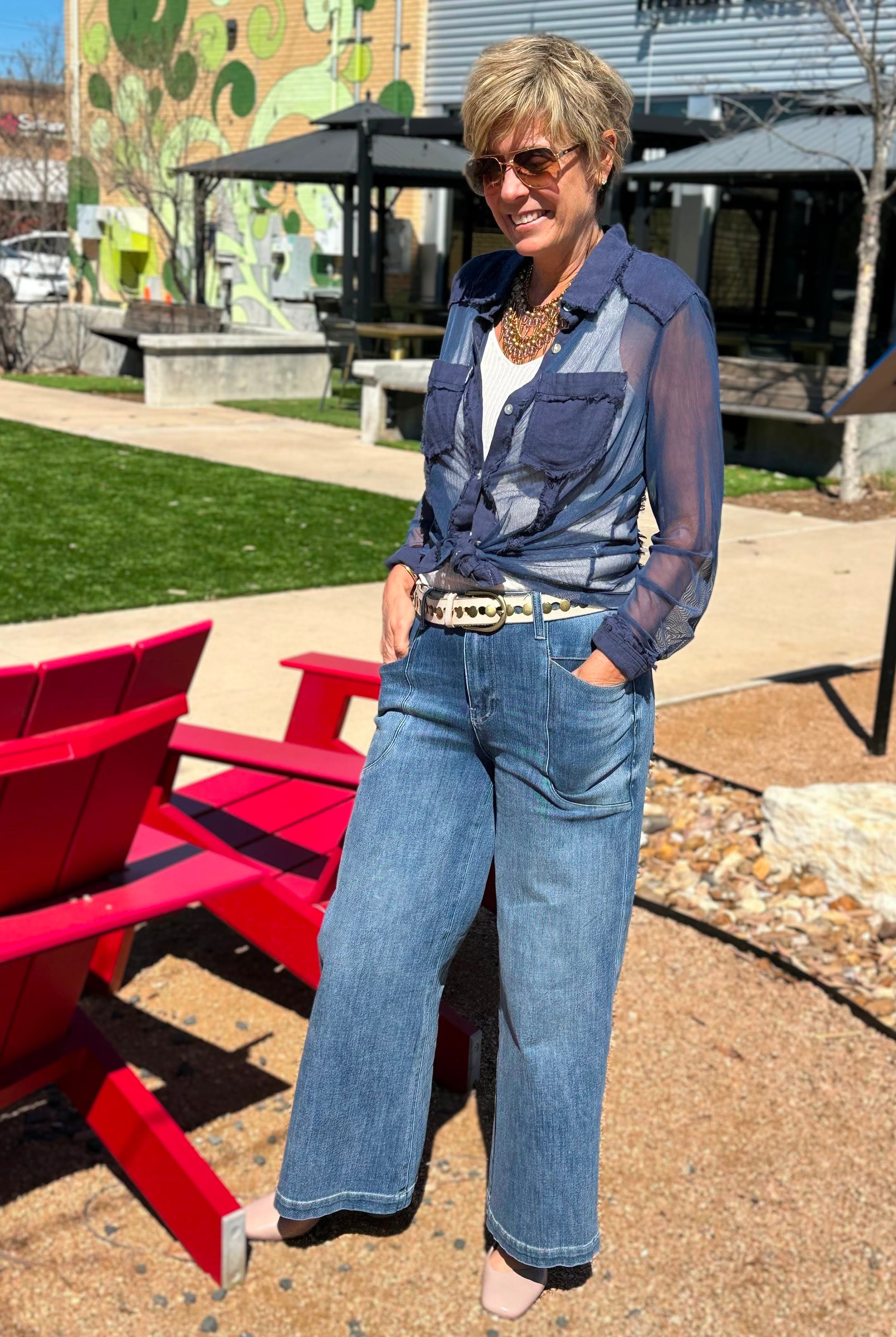 This versatile mesh sheer button-up top is the ultimate layering essential for effortless style. Wear it solo over a tank with your favorite pants, or drape it elegantly over a bias-cut satin slip dress for an elevated look. The rich navy hue brings depth and sophistication, while the sheer mesh fabric adds an edgy, modern edge that works for both casual and dressed-up occasions. A perfect for fashion-forward piece that transitions seamlessly through your wardrobe.