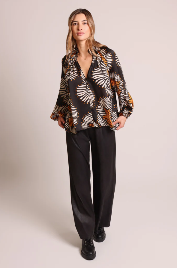 This top is stunning in this black white and orange floral style print. Dress it up or down - either way you're good to go. It's a flattering loose fit blouse, with a V-neck and a smocked detail on the collar. A great easy-to-style piece to add to your Autumn wardrobe.