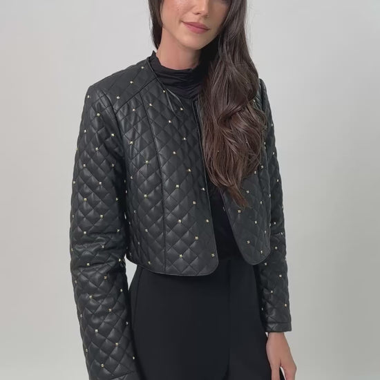 Step into style with the Frank Lyman quilted leather overclothes. This regular-fit top features a chic collared neckline and straight long sleeves, perfect for both casual and semi-formal occasions. The waist-length design, enhanced with jewels and a zipper, adds an edgy yet feminine touch. Ideal for those seeking a blend of comfort and sophistication.